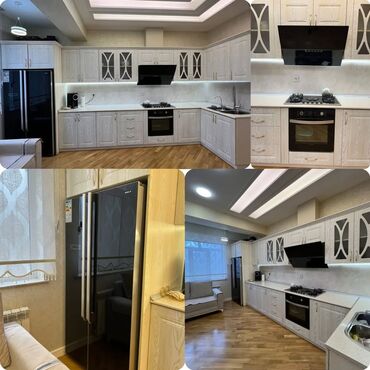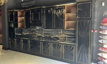- Müxtəlif üslublarda mətbəx həlləri: parlaq krem və qara mermer effektli panel-komplektlər, klassik naxışlı ağ fasadlar, ağac tonlarında L-form sistemi, həmçinin qızılı xəttli premium qara dizayn.