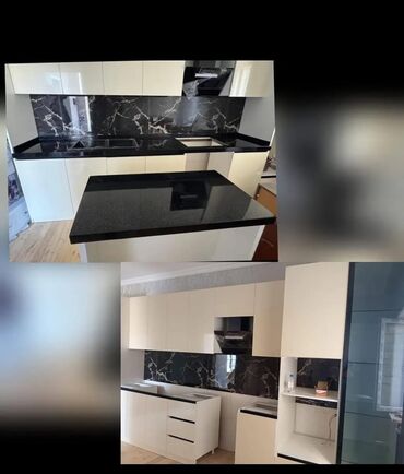 - Üst örtüklər: tünd daş/kompozit stolüstülər, arxa panel və tezgahda mermer fakturalar.