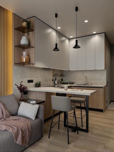 - Kiçik məkanlar üçün kompakt künc mətbəxi və bar tipli masa.