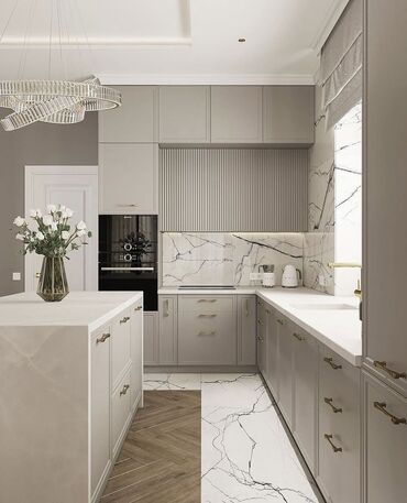 - Stolüstü: kvars/daş kompozit, yüksək davamlı laminat; mərmər fakturalı panel arası (fartuk).