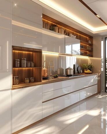 - Parlaq ağ fasad + təbii ağac tonlarında açıq raflar və gizli LED.