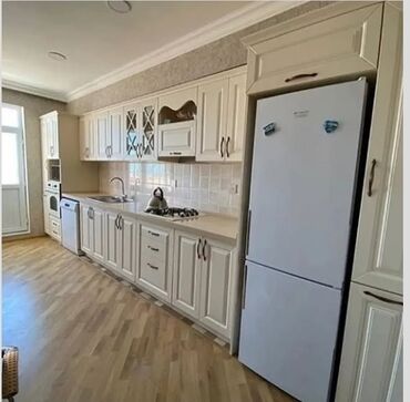 - Üst dolablarda şüşəli vitrin qapılar, dekorativ karniz və pilastr detallar.