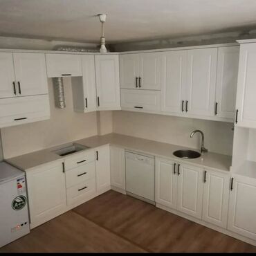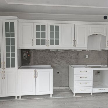 - Layihə: L formalı və düz xətt planlı mətbəxlər, yuxarı-aşağı dolab kombinasiyaları, daxili qab-qacaq vitrinləri və şüşəli fasad seçimləri.