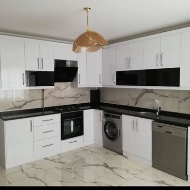 - Materiallar: MDF/MDFlam fasadlar, daş və ya kompozit tezgahlar (qara və açıq tonlar), mərmər naxışlı divar paneli (fartuk) seçimləri, keyfiyyətli menteşə və rels sistemləri (yumşaq bağlanma).