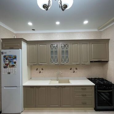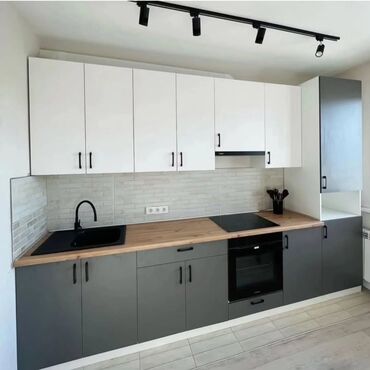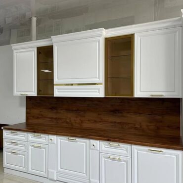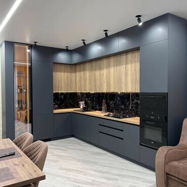 - Dizaynlar: klassik frezeli fasadlar, vitrinli şkaflar, minimal və loft üslubunda mat fasadlar, iki rəngli kombinasiyalar, şüşəli vitrin və açıq rəf həlləri.