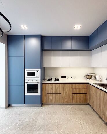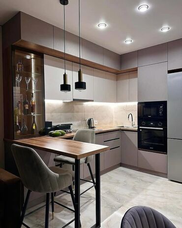 - “L” formalı planlama və tam hündür şkaf blokları: soyuducu, soba və mikrodalğan üçün inteqrasiya olunmuş nişlər