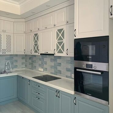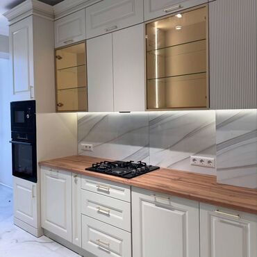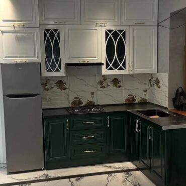 - Lövhə və fasadlar: Klassik frezli qapılar, şüşəli vitrinlər (dekorativ kəsişməli), həmçinin minimal xəttli müasir fasadlar. Parlaq boz, ağ, krem və tünd yaşıl tonların kombinasiyaları.