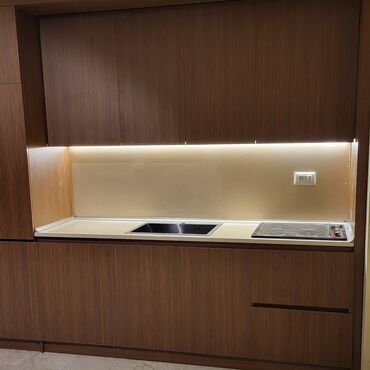 - Materiallar: MDF boyalı (mat və ya parlaq), MDF/Laminat ağac dekoru, lamel MDF, HPL və ya melamin örtüklər; təbii/kvarts/akril stolüstüləri; şüşə və ya metal dekor elementləri.