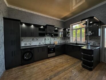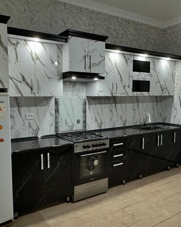 - Materiallar: Rütubətədavamlı MDF/LDSP korpus, parlaq MDF/AKRİL fasadlar, qara “daş” effektli stolüstü.