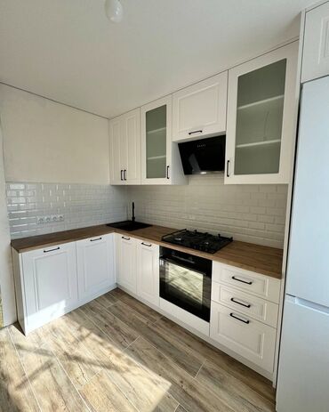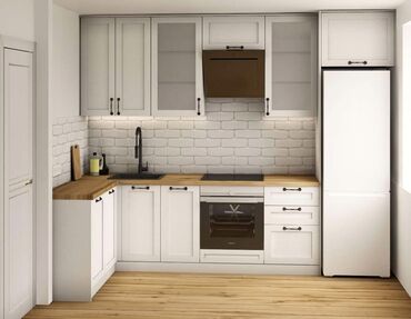 Mətbəx mebelinin dizaynı və yığılması xidməti - Layihə: L və U formalı kompozisiyalar, düz xəttli həllər; üst və alt modulların tam komplekti - Üst dolablar: parlaq və mat fasad variantları (ağ, b...