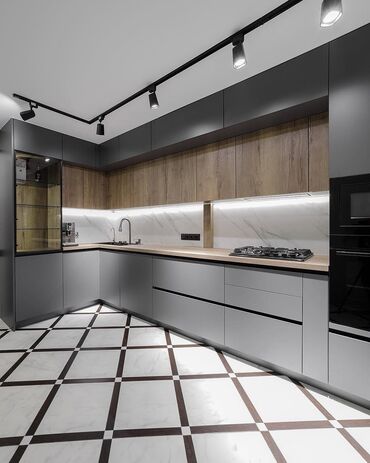 - Saxlama: üst və alt modul şkaflar, dərin çekmecələr, karusel/künc həlləri, şüşə vitrin seçimi