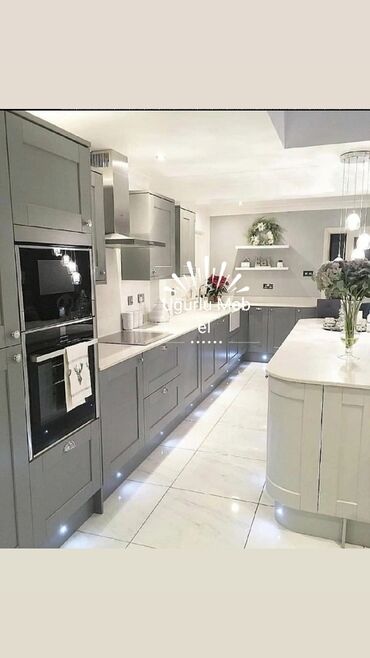 - Dizayn: düz xətli, minimalistik üslub; L formalı və bir xəttli planlar. Ağırlıqlı rənglər: ağ, boz, qrafit, krem və bənövşəyi-ağ kombinasiyası.