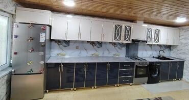 - Materiallar: nəmə davamlı korpus, parlaq/fasad örtükləri, mərmər naxışlı stolüstü və arxa panel (fartuk) seçimləri.