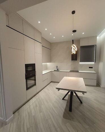 - Aksesuarlar: qazan-qab üçün dərin çekmecələr, çəngəl-bıçaq bölücüləri, qurutma şkafı, yumşaq bağlanma; LED işıqlandırma zolaqları, tavan spotları və dekorativ asma işıq.