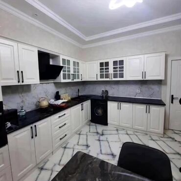 - Ağ klassik vitrinli yuxarı dolablar, qara iş masası və mərmər naxışlı arxalıq.