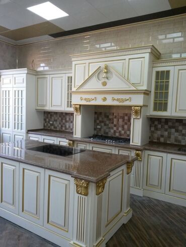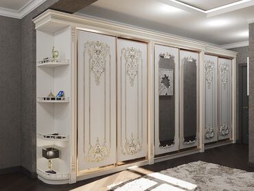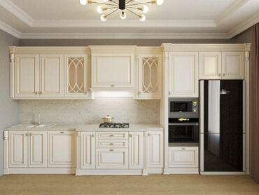 - Klassik və müasir üslubda mətbəx mebellərinin layihələndirilməsi və hazırlanması: ağ krem, iki rəngli (yuxarı açıq, aşağı zeytun/boz) variantlar, hündür dolablar, vitrajlı fasadlar, frezəli dekor elementləri.