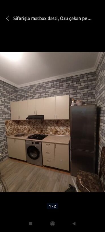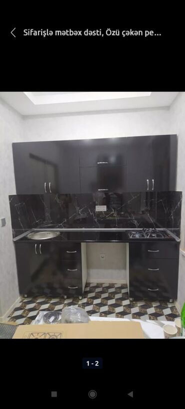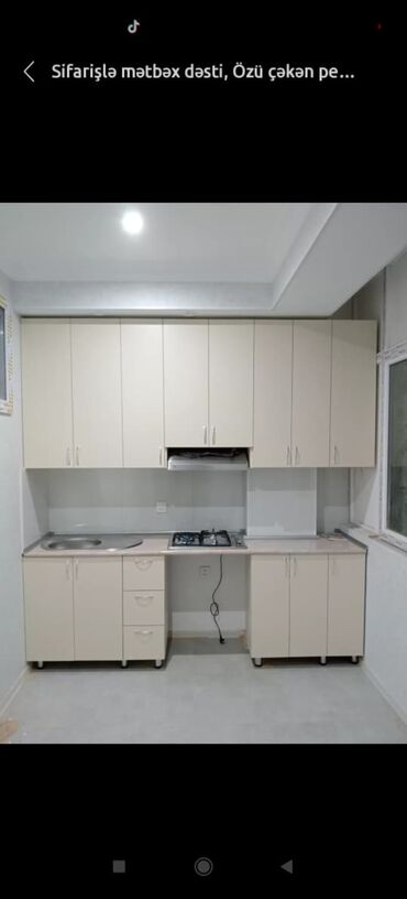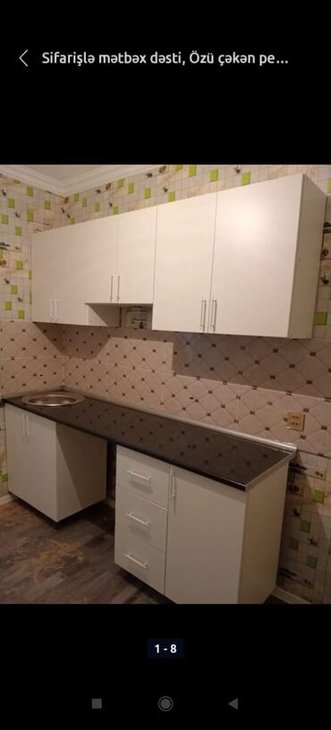 Müxtəlif rənglərdə mətbəx mebeli dəsti. Dolablar və çekmeceler daxildir. Kiçik mətbəxlər üçün idealdır.