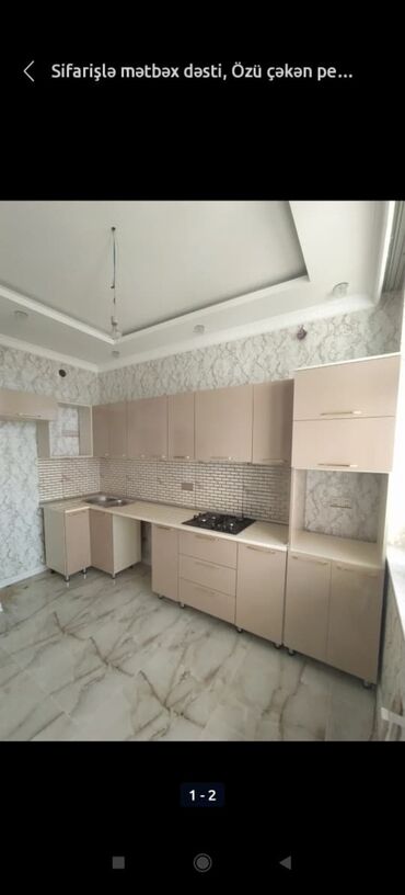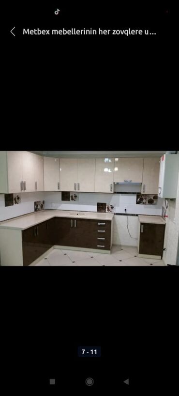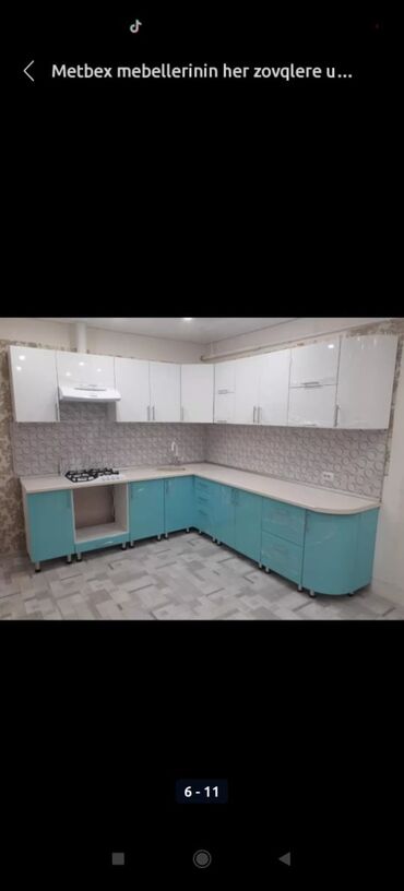 Müxtəlif rənglərdə mətbəx mebeli dəsti. Dolablar və çekmeceler