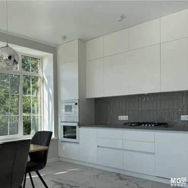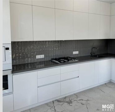Təmiz xətlər, işıqlı görünüş və funksional saxlama ilə geniş mətbəxlər üçün ideal seçim. MGS Mebel loqolu orijinal layihə.