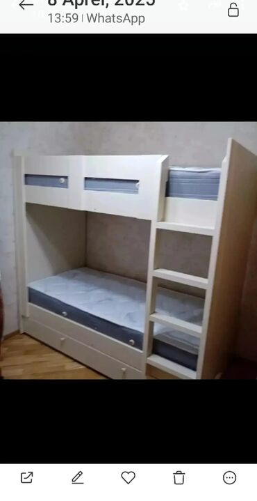 - Uşaq üçün iki mərtəbəli çarpayı: yuxarı-aşağı yataq yerləri, təhlükəsiz nərdivan, alt hissədə saxlama çekmecələri.