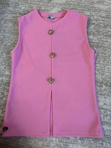 - Qolsuz, düz siluetli çəhrayı üst. Yumşaq, elastik trikotaj parça. Dəyirmi yaxa, ön hissədə dekorativ qızılı düymələr (yarpaq formalı elementlərlə) və aşağı hissədə ön yarıq detalı.