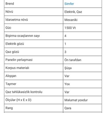 ALEV quraşdırılan qaz paneli - 3 qaz ocağı + 1 elektrikli göz - Sağda mexaniki idarə paneli: 4 ədəd fırlanan düymə, alov tənzimlənməsi -ruçkaları istiliye davamli metal yanmaz erimez - reşotkala...