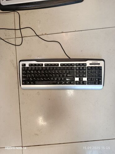 Qara-gümüş rəng palitrası, masaüstü kompüterlər üçün uyğundur, uzun kabel sayəsində rahat yerləşdirmə imkanı verir. Ofis işi, tədris və gündəlik istifadə üçün praktik seçimdir. Şəkillərdə göstərilənlər satılır. Foto tarixçəsi: 15.09.2025. Model üzərində “GIGABYTE” loqosu ikinci klaviaturada görünür.