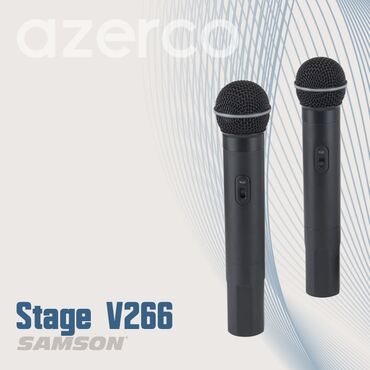 Karoke mikrafonu Samson Stage 266 simsiz mikrofon sistemi. İki ədəd əl mikrofonu və qəbuledici cihazdan ibarətdir. Qəbuledici cihazda iki antenna və səs səviyyəsini tənzimləmək üçün düymələr mövcuddur. Komplektə həmçinin enerji adapteri və birləşdirici kabellər daxildir. Tədbirlər, karaoke və ya təqdimatlar üçün uyğundur.