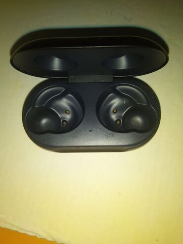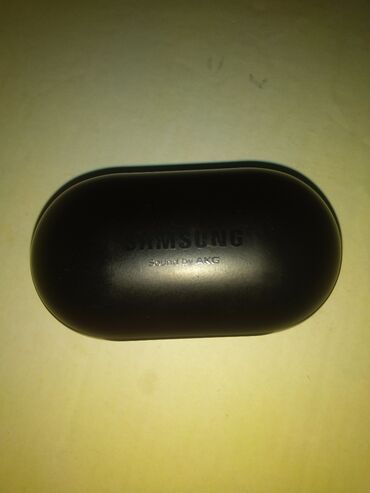 - Samsung “Sound by AKG” simsiz qulaqlıq qutusu: oval, qara rəng, maqnitli qapaq, içində L/R işarələnmiş yuvalar, kontaqlar görünür.