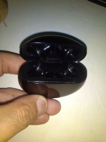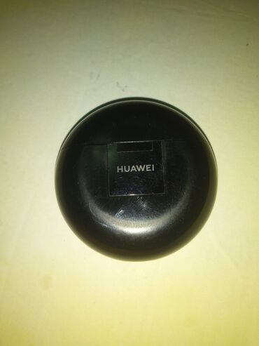 - Huawei qulaqlıq qutusu: kompakt, qara rəng, dairəvi forma, arxada USB-C portu görünür.
