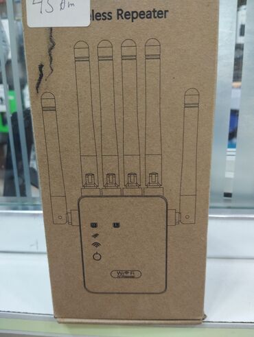 Ağ rəngli, dörd xarici antenası olan bu WiFi təkrarlayıcı mövcud simsiz şəbəkənin əhatə dairəsini genişləndirmək üçün nəzərdə tutulub. Cihazın ön hissəsində və qutusunun üzərində "WiFi Repeater" ya...