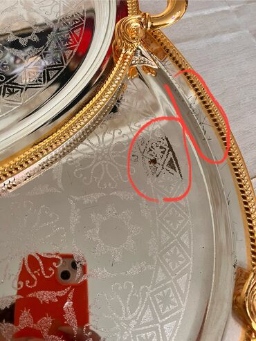 Sini ( podnos) 2 əd. Təzədir, istifadə edilmədiyi üçün birinin üzərinə ləkə düşüb. 2 ci fotoda işarələnib.
