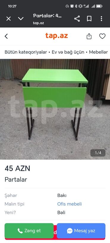 Qeyd: Şəkillərdə həm ağ, həm də ağac rəngli parta-stul nümunələri göstərilib. 45 AZN qiymət etiketi olan yaşıl parta şəkli də mövcuddur. Telefon nömrəsi paylaşılmır.