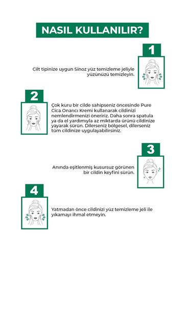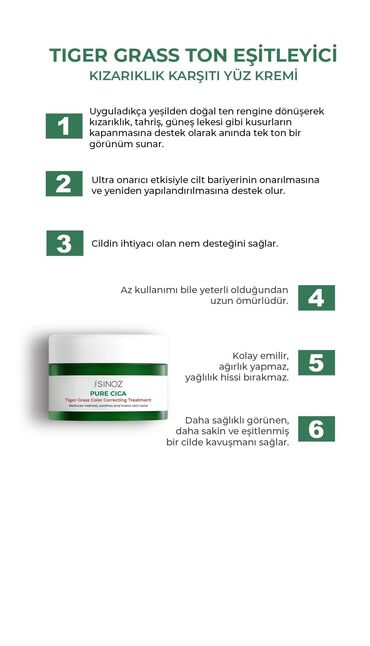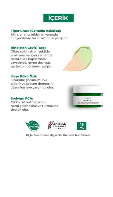 Sinoz Pure Cica, xüsusilə həssas və qıcıqlanmış dərilərə yönəlmiş, sakitləşdirici və bərpaedici xüsusiyyətlərə malik bir dəri baxım məhsuludur. Cica (Centella Asiatica) bitkisinin tərkibində olan təbii xüsusiyyətlər, dərinin qızartılarını və qıcıqlanmalarını aradan qaldırmağa kömək edir, dərini yenidən bərpa edir. Sinoz Pure Cica, günəş yanığı, quru və zədələnmiş dəri üçün təsirli olan sakitləşdirici təsir göstərir və dərinin təbii müdafiə qabiliyyətini gücləndirir. Həmçinin bu məhsul, sızanaqdan sonra qalan izləri azaltmağa və dərinin ümumi tonunu bərabərləşdirməyə kömək edir. Sinoz Pure Cica, nəmləndirici tərkibi ilə dərini qidalandırır və onun təbii parıltısını artırır, eyni zamanda dərini xarici təsirlərdən qoruyur.