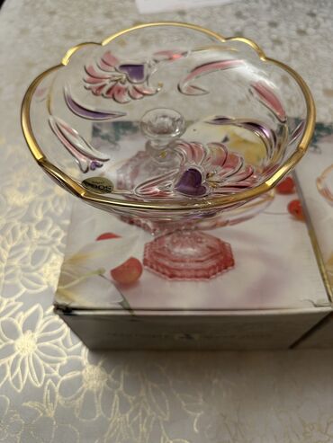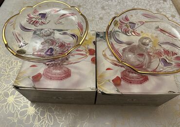 2ədəd-25azn.Çox keyfiyyətli şirniyyat qabı dəsti,qırağları və ayağ hissəsi qızıl suyuyla işləməli.Dəst təzədir heç istifadə olunmayıb. Tək halda da satılır 1ədəd -15 azn.