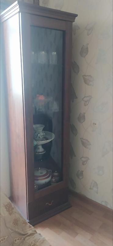 Mebel dəsti – qonaq otağı üçün vitrinli divan sistemi və ayrıca paltar şkafı - Material: ağac fakturalı laminat (isti qəhvəyi ton), klassik frezeli panellər - Qonaq otağı vitrini: - Künc-birləşm...