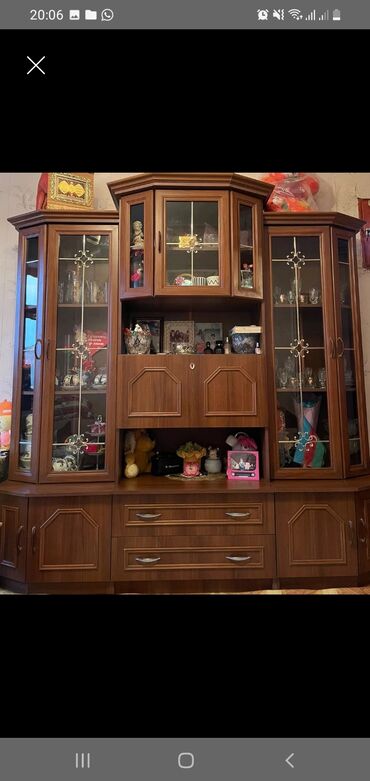 Bu dəst həm yataq otağı, həm də qonaq otağı üçün praktik saxlama imkanı yaradır: vitrində qab-qacaq və dekor, şkafda geyim və tekstil rahat yerləşir. Klassik dizayn, isti qəhvəyi ton, eyni üslubda komplekt görünüş.