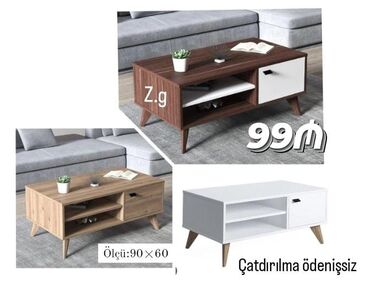 - Material: Laminat/MDF tipli lövhə və ağac effektli ayaqlar (şəkillərdəki görünüşə əsasən)