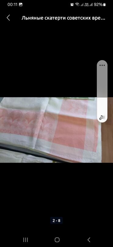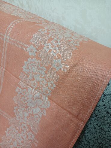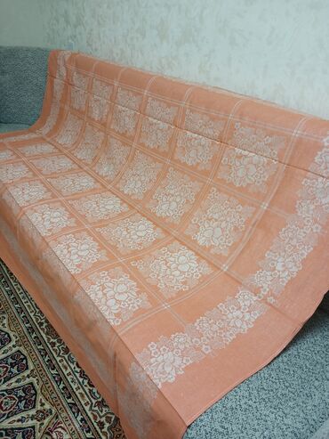 Məhsul: Süfrə (SSRİ istehsalı, Orşa kətan kombinatı) Xüsusiyyətlər: - Material: kətan/parça, parıltılı işlənmə (etiketdə “Отделка глянцевая” qeyd olunub) - Rənglər: açıq şaftalı-ağ tonlarda jakard...