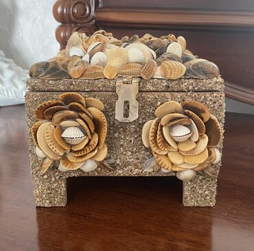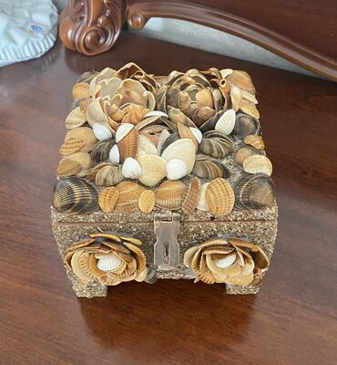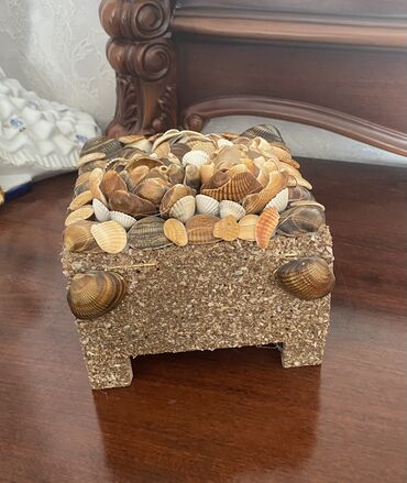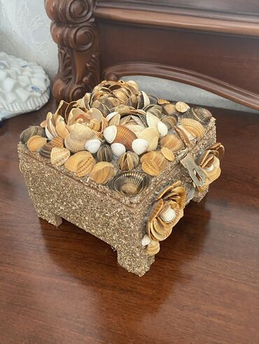 Dəniz qabıqları ilə bəzədilmiş dekorativ taxta qutu - Material: taxta korpus, üzəri təbii dəniz qabıqları və qum teksturası ilə örtülüb - Dizayn: qapağın üstündə müxtəlif ölçülü qabıqlardan düzəld...