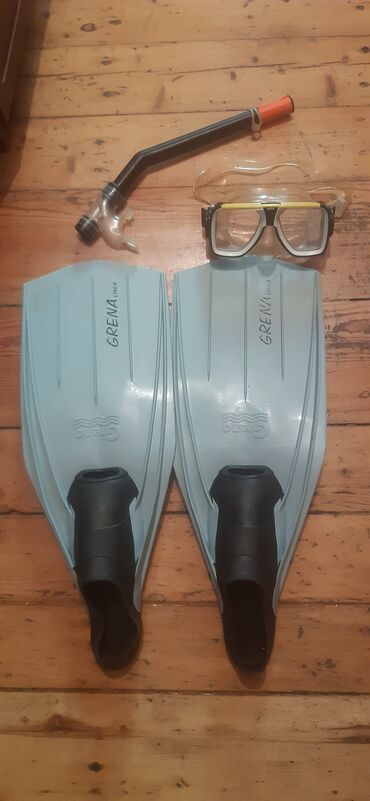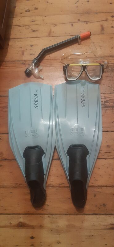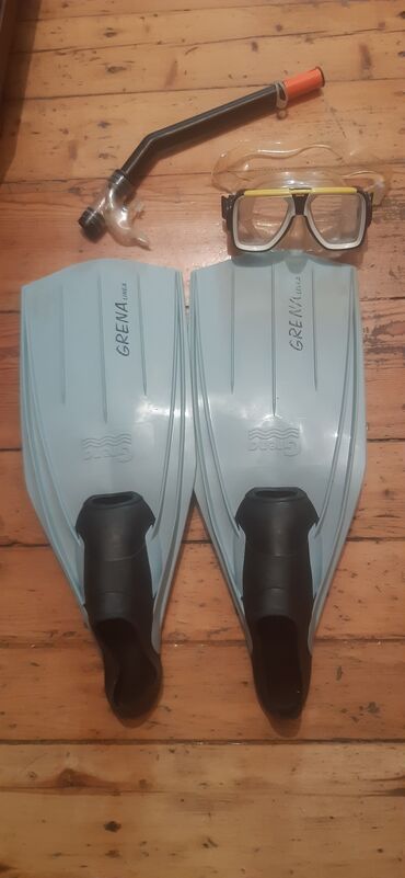 Mavi rəngli üzgüçülük ləvazimatları dəsti. Dəstə bir cüt üzgüçülük ləvazimatı, tənəffüs borusu və üzgüçülük maskası daxildir. Üzgüçülük ləvazimatları "GRENA" brendinin istehsalıdır, ayaq hissəsi qara rəngdədir. Maska şəffaf linzalıdır və sarı kənarlı dizaynı var. Tənəffüs borusu qara rəngdədir, ağız hissəsi isə şəffafdır. Narıncı ucluğu tənəffüs borusunu suda asanlıqla görünən edir. Bu dəst suya dalmaq və sualtı dünyanı kəşf etmək üçün idealdır.