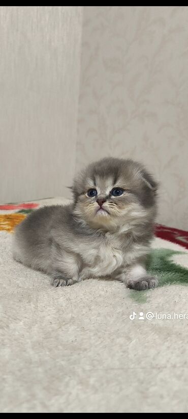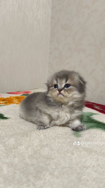 Scottish Fold long hair balası – tüklü, gümüşü-boz rəngli, mavi gözlü. Xüsusiyyətlər: - Qısa qulaqlar (qatlanmış), yumru üz və ifadəli böyük gözlər - Yumşaq, sıx, tüklü örtük; gümüşü-boz (smoke/sh...199 AZN