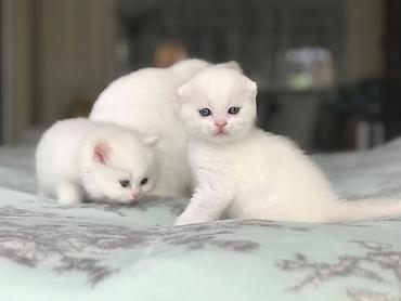 - Şəkillərdə həm gümüş zolaqlı, həm də ağ balalar göstərilib; yuvarlaq pəncələr və qısa quyruqla tipik Skottiş Fold görünüşü