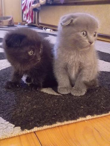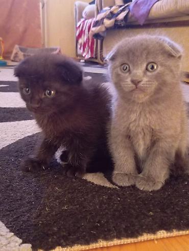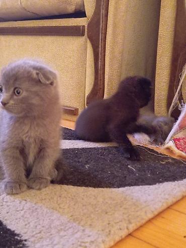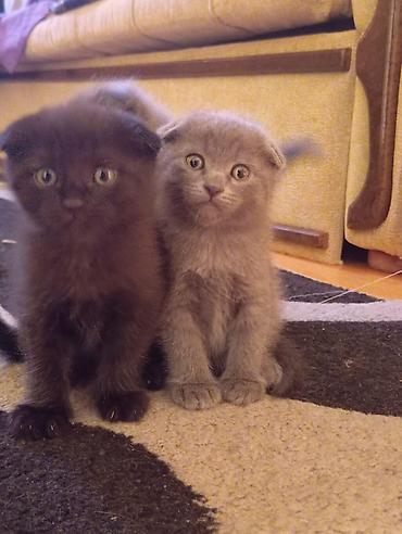 Şəkillərdə iki bala görünür: biri boz, biri qara rəngdə, hər ikisi tipik Scottish Fold xüsusiyyətləri ilə. Evdə sakit, mehriban ev heyvanı axtaranlar üçün ideal.