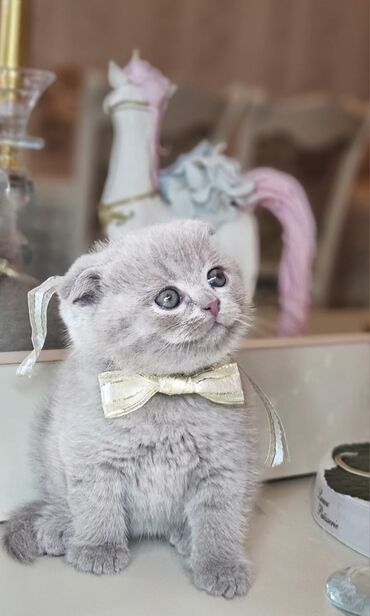 Şəkildəki balalar zərif bant aksesuarları ilə təqdim olunur və dekorativ mühitə uyğun, çox şirin görkəmə malikdirlər. Scottish Fold cinsi sakit temperament və ailəyə bağlılığı ilə tanınır, evdə rahat, mehriban yoldaş axtaranlar üçün ideal seçimdir.