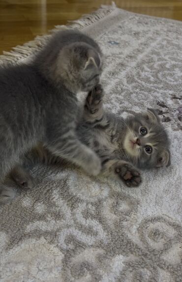 Boz rəngli, zolaqlı pişik balaları - Cins tipi: Şotland qıvrım qulaqlı (fold) və düz qulaqlı qarışıq – şəkillərdə həm qıvrım, həm də düz qulaqlı balalar var - Rəng: gümüşü-boz “tabby” zolaqlı - Xü...