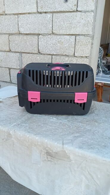 - Pişik üçün möhkəm plastik daşıma boksu (qara rəng, çəhrayı kilidlər və yuxarıda daşıma dəstəyi, çoxsaylı havalandırma pəncərələri)