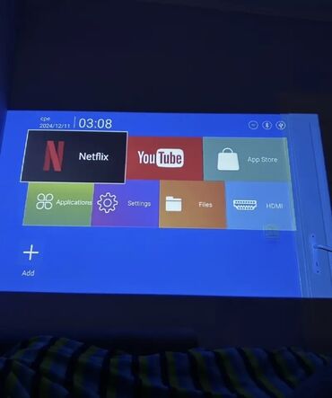 - Daxili smart interfeys: ekranda Netflix, YouTube, App Store, Applications, Settings, Files, HDMI kimi tətbiqlər və menyular görünür