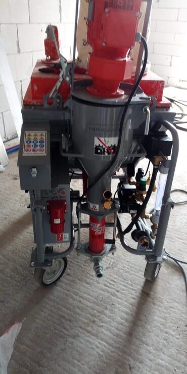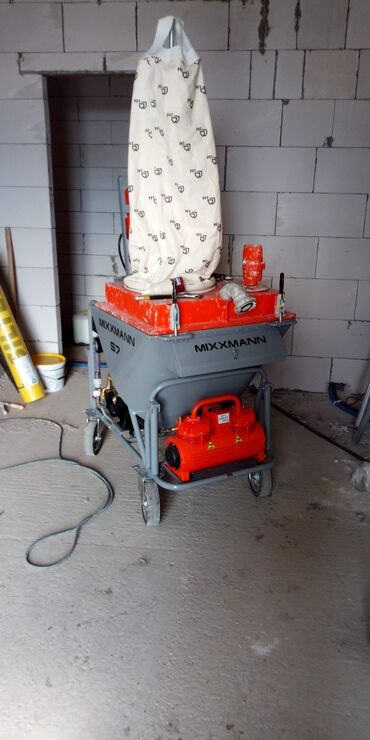 Sənaye suvaq maşını "Mixxmann S7" modeli ilə təqdim olunur. Bu maşın tikinti işlərində suvaq və digər qarışıqların tətbiqi üçün nəzərdə tutulub. Onun mobil konstruksiyası təkərləri sayəsində asanlıqla daşınmasını təmin edir. Qırmızı rəngdə motor və nasos hissələri ilə, bu maşın yüksək performans və dayanıqlıq vəd edir. Maşının üzərindəki ağ parça torba əlavə materiallar üçün istifadə oluna bilər. Məhsulun istifadəsi tikinti proseslərini sürətləndirməyə və daha səmərəli etməyə imkan verir.