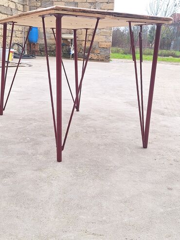 - Rənglər: təbii açıq qəhvəyi ağac + bordo metal ayaqlar.